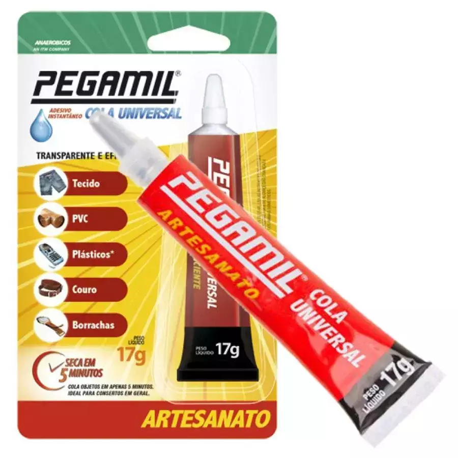 Pegamil Cola Universal Artesanato é um adesivo desenvolvido especialmente para uso em trabalhos manuais, hobbies, artesanatos e para reparos em casa, no escritório e na escola. Indicado para colagem de papel, cartão, passamanaria, telas, cartolina, madeira, couro, acrílico, PVC. Pegamil Cola Universal Artesanato é rápido e fácil de limpar. Não adere em polietileno, polipropileno e PTFE.